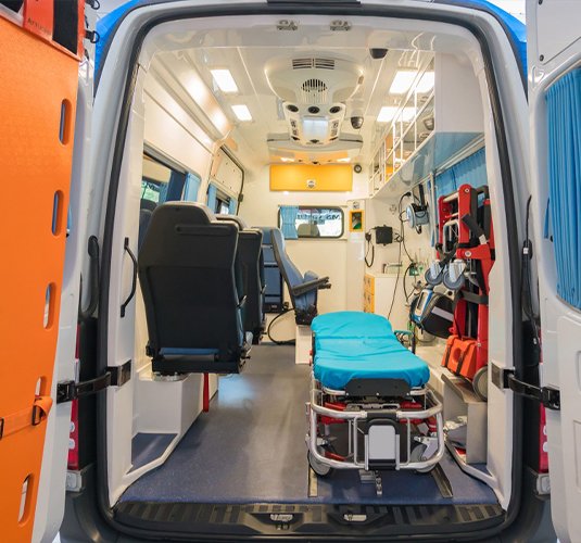 Every vehicle includes stretchers, oxygen cylinders, cardiac monitors, and first-aid kits.